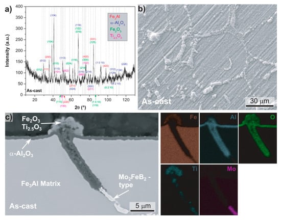 - Li, X.; Prokopčáková, P.; Palm, M. Microstructure and mechanical properties of Fe-Al-Ti-B alloys with additions of Mo and W. Mater. Sci. Eng.: A 2014, 611, 234–241. [Google Scholar] [CrossRef]