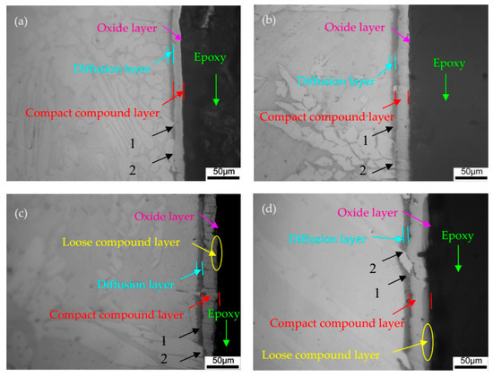 Cross-sectional microstructure of the samples nitrided at different temperatures: (a) 550 °C; (b) 570 °C; (c) 590 °C; (d) 610 °C.
