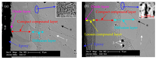 To further study the effect of the nitriding temperature on the microstructure, typical samples of ferritic nitrocarburizing (570 °C, see Figure 1b) and austenitic nitrocarburizing (610 °C, see Figure 1d) were scrutinized for high-magnification SEM observations, as shown in Figure 2.