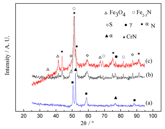 Microstructure observation shows that the morphology of the nitrided layer changes when the nitriding temperature is higher than 590 °C. To evaluate the effect of the nitriding temperature on the phase compositions of the surface layer, the substrate and typical samples of ferritic nitrocarburizing (Figure 1b) and austenitic nitrocarburizing (Figure 1d) were selected for XRD tests. The results are shown in Figure 3.