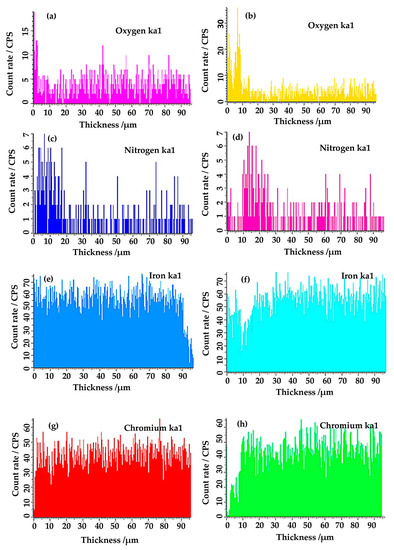 Figure 4 displays the EDS line scans of oxygen, nitrogen, iron, and chromium of the typical samples of ferritic nitrocarburizing (Figure 2a) and austenitic nitrocarburizing (Figure 2b), from the surface to the center (0–90 μm). From Figure 4a,b, it can be seen that the thickness of the oxidized layer (characteristic of a high oxygen concentration) of the sample treated at 570 °C is about 3 μm, while it increases to approximately 10 μm at 610 °C. The reason is that the loose compound layer at 610 °C is thicker than that at 570 °C. It is a sponge-like or columnar porous structure that makes oxygen atoms to diffuse easily into the inner layer through these micropores, promoting the formation of Fe3O4. In contrast, the oxygen concentration in other layers closer to the substrate is rather low. This implies that the existence of micropores promotes the oxygen diffusion.