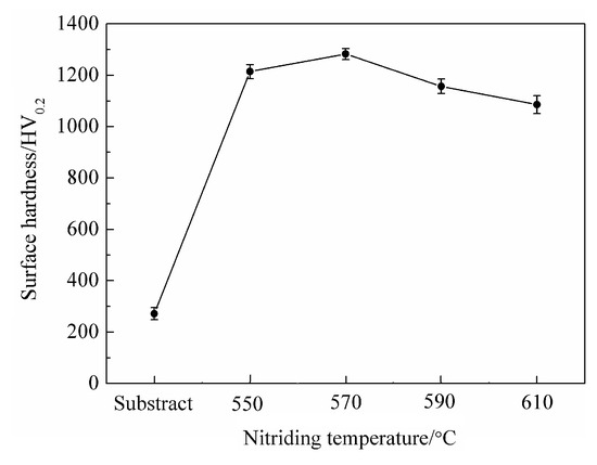 The substrate and four samples treated at 550, 570, 590, and 610 °C were selected for microhardness tests, and the results are shown in Figure 5.