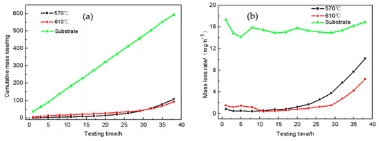 With the increase of testing time, the loose compound layer at 610 °C is gradually worn off, and the compact compound layer with higher hardness is exposed and starts to play a role. Consequently, the wear rate decreases. When the testing time is over 11 h, the wear rate of the sample nitrided at 610 °C is lower than that at 570 °C. In the case of over 29 h, the cumulative mass loss of the former is higher than the latter.