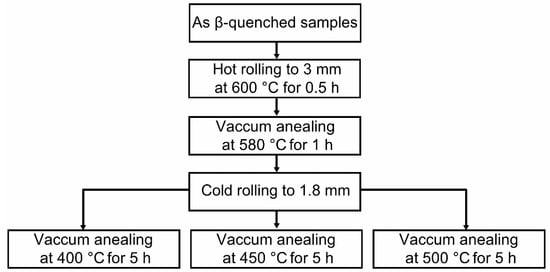 A β-quenched Zr–Sn–Nb–Fe–Cu–O alloy sheet with a thickness of 10 mm was used as the experimental material. The nominal chemical compositions of this alloy were 0.55% Sn, 0.32% Fe, 0.35% Nb, 0.05% Cu, and 0.079% O, with Zr as the balance. The experimental alloy was hot rolled to 3 mm and annealed at 580 °C for 1 h. Then, the alloy was cold rolled to 1.8 mm and cut into three parts, which were finally annealed at 400 °C, 450 °C, and 500 °C for 5 h, respectively. The details of the processing procedure are shown in Figure 1. Like the other metallic materials [23,24,25,26,27], the excessive concentration of alloying elements beyond the solution solubility of Zr would lead to the formation of second-phase particles (SPPs), as frequently observed in various Zr alloys [28,29,30]. It has been also reported that SPPs can hardly grow during low-temperature annealing [31,32]. It is known that the recrystallization temperature of Zr alloys is about 480~500 °C, depending on their chemical compositions [33]. Therefore, the final annealing at 400~500 °C was selected for heat treatment in order to minimize the effect of SPPs on oxygen diffusion during corrosion tests.