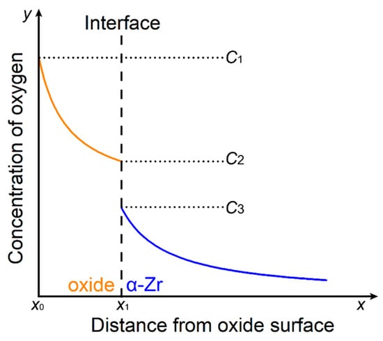 Therefore, a two-phase model, suggested in the literature, was used to illustrate the concentration of oxygen in oxide films and in the adjacent substrate [39,40]. In this model (Figure 2), the concentration of oxygen was assumed to follow a parabolic law, since the diffusion of the element meets the Arrhenius equation for the given temperatures and metallic materials [41,42,43]. As represented in Figure 2, the x axis indicates the distance from the oxide surface; x0 is the oxide surface and x1 is the oxide/substrate interface. As the corrosion proceeds, the oxide/substrate interface (x1) moves towards the substrate, thickening the oxide films. The y axis is the concentration of oxygen in the oxide film and the substrate. C1 is the oxygen concentration at the oxide/environment interface, which equals 1.526 g/cm3 [35]. C2 is the concentration of oxygen at the oxide/substrate interface (oxide side). The concentration’s value is 1.5494–9.7 × 10−4 T g/cm3 [35], where T is the absolute temperature in K. Because T was 633 K in this work, C2 is equal to 1.486 g/cm3. C3 is the concentration of oxygen at the oxide/substrate interface (substrate side) and can be regarded as the saturation concentration of oxygen in α-Zr. For the Zr–O phase diagram [16], C3 was calculated to be 0.459 g/cm3.