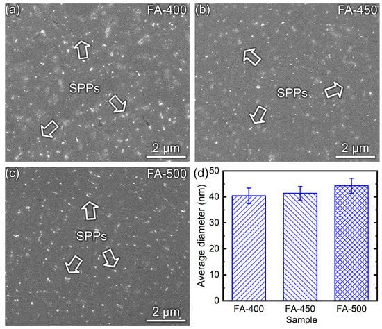Figure 3 shows the SEM images for the microstructures of the alloy samples and the statistical information of the SPPs. As seen in Figure 3a–c, all samples have a similar microstructure. Numerous tiny SPPs (as indicated by hollow arrows) are uniformly distributed in the matrix. The average diameters of SPPs for FA-400, FA-450, and FA-500 are revealed in Figure 3d. The SPPs in FA-400 have an average diameter of 40 nm (Figure 3d). Although heat treatment can enhance the growth of SPPs in Zr alloys [28,44], the average diameter of SPPs in FA-450 (41 nm) is almost the same as that in FA-400. The FA-500 has a slightly larger average diameter for SPPs (43 nm) than FA-400 and FA-450. However, compared with the SPPs in some Zr alloys (ranging from 50~100 nm in average diameter), the SPPs in the samples used in this work are significantly small and have no apparent distinction, which is attributed to their relatively low temperature in the final annealing treatment [28,44]. Chai et al. [28] pointed out that the SPPs in the Nb-containing Zr alloys have a larger coarsening activation energy than those in the Nb-free Zr alloys. Therefore, it is reasonable that no obvious distinction in the size of SPPs is observed in the samples annealed at at 400~500 °C.
