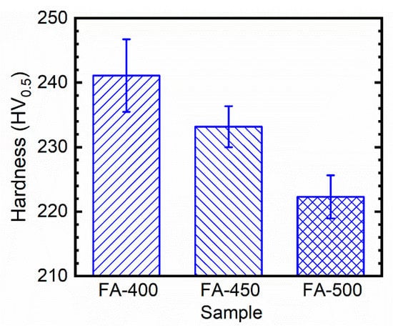 The hardness of FA-400, FA-450, and FA-500 continuously decreases while increasing the annealing temperature (Figure 4). FA-400 has the highest hardness of 241 HV, which is greater than the hardness of FA-450 and FA-500 (233 HV and 222 HV, respectively). It is well known that defects (such as dislocations or boundaries) can be induced in the alloys after deformation [45,46,47]. Such defects enhance the hardness and strength of the alloys and can be healed by heat treatment [48,49,50]. Yang et al. [51] suggested that the strengthening effect of SPPs in Zr alloys during heat treatment is often minimal. Therefore, variation in the hardness of the samples should be attributed to a change in the Zr matrix. Since the melting point temperature (Tm) of Zr is 1855 °C (2128 K), the recovery temperature and recrystallization temperature of Zr can be calculated to be 0.35Tm of 472 °C (745 K) and 0.4Tm of 578 °C (851 K), respectively [29]. As such, the final annealing temperature of 400 °C is significantly lower than the recovery temperature. In comparison, 450 °C is slightly lower than the recovery temperature while 500 °C is somewhat higher than the recovery temperature but significantly lower than the recrystallization temperature. Due to recovery, the defects induced by cold rolling would disappear during the final annealing [49]. Apparently, the sample with the lower final annealing temperature would have a larger number of defects. As a result, different processing procedures lead to different substrate conditions for the samples.
