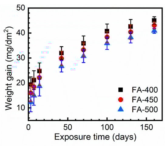 (2) The alloy samples are corroded in an autoclave in LiOH aqueous solution at 360 °C for up to 160 days. The weight gain of the samples closely follows the parabolic law of . The fitting results show that the values of are 0.222, 0.256, and 0.308 for FA-400, FA-450, and FA-500, respectively. By contrast, the values of are 14.240, 11.554, and 8.449 for FA-400, FA-450, and FA-500, respectively, which shows a reversed order compared to the values of . Such results indicate that the weight gain of FA-400 increases fastest at the very initial stage of the corrosion test, but the oxide film grows slowest as the corrosion progresses.