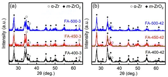 Oxygen’s diffusion into the substrate is important to the growth of the oxide formed on the samples, since α-Zr has a maximum solubility of 28.6 at.% for oxygen at 300~400 °C [16]. If the concentration of oxygen exceeds 28.6 at.%, new oxides would be formed at the oxide/substrate interface. In this work, all samples reveal a significantly distinctive hardness after cold work followed by low-temperature annealing. One can understand that the deformation generally induces defects (such as boundaries and dislocations) to the metallic materials, and such defects can be healed by heat treatment [57,58,59]. In terms of the temperature adopted in heat treatment, recovery takes place in the heat-treated metallic materials [60,61]. The samples heat-treated at different temperatures result in a distinguished number of defects in the microstructure and, therefore, show significantly different hardness. Substantially, these findings elucidate that the FA-400, FA-450, and FA-500 samples have different substrate conditions.