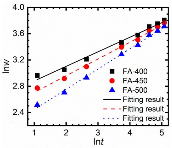 Inputting the values of and obtained in the corrosion test (Figure 5) into Equation (3), one can obtain the values of and for different samples by linear fitting, as plotted in Figure 7. The fitting results are listed in Table 1. Apparently, the slopes of are significantly different, indicating that the three samples have distinctive corrosion rates. For a parabolic curve, the exponential illustrates the gradient of the function value at a given base number. FA-400 has the smallest of 0.222 compared with the other two samples (0.256 and 0.308 for FA-450 and FA-500, respectively), illustrating that the oxide film formed on FA-400 has the lowest growth rate among the three samples during the corrosion test. However, these three samples show significantly different values. is the intercept, specifying the weight gain of the samples when equals 1. Hence, can also be used to elucidate the initial weight gain of the samples in the very beginning of the corrosion test. FA-400 has the largest value of among the three samples, indicating that the growth rate of the oxide film formed on FA-400 is the highest in the very beginning of the corrosion test but becomes the lowest as the corrosion processes. By contrast, the weight gain of FA-500 is the lowest after a 3-day exposure. Nevertheless, the oxide film formed on FA-500 grows faster than the film formed on the other two counterparts. Therefore, combining the mechanism for the formation and growth of oxide films formed on Zr alloys [6,12,15], one can conclude that the diffusion coefficients of oxygen should be different in the oxide films formed on the samples.