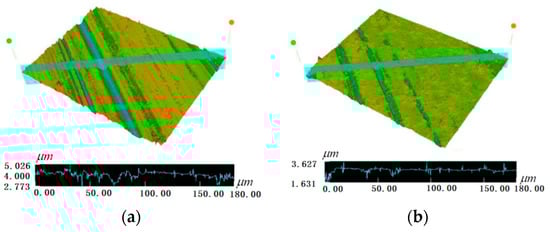Surface morphology with different loads: (a) 40.82 mm/s, 0.51 MPa; and (b) 40.82 mm/s, 2.55 MPa.