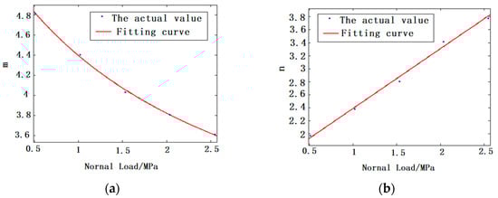 Fitting curves between m and n and the normal load: (a) fitting curve between m and the normal load; and (b) Fitting curve between n and the normal load.