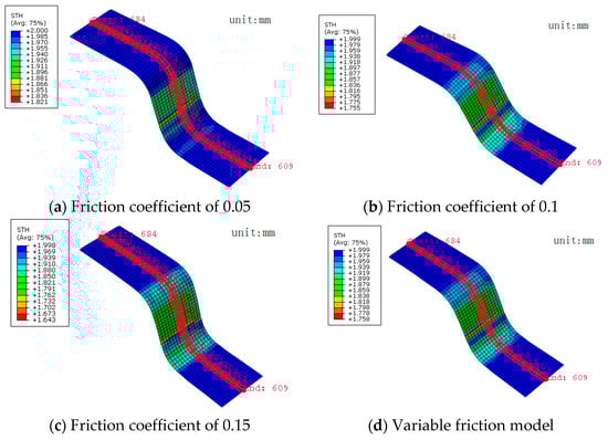 Sheet thickness (STH) under different friction coefficients: (a) friction coefficient of 0.05, (b) friction coefficient of 0.1, (c) friction coefficient of 0.15 and (d) variable friction model.