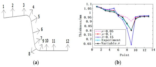Thickness measuring points and comparison: (a) thickness measuring points; (b) thickness comparison between numerical result and actual measurements.