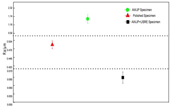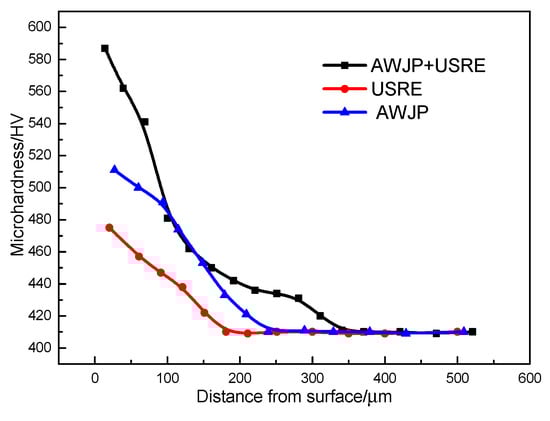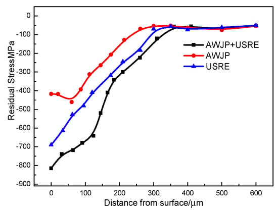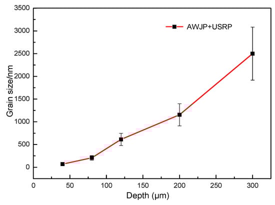 - In the surface state, the modified composite plastic deformation layer reaches 310 µm from the surface. The composite modification at a depth of 90 µm is comparable to a single modified layer at a depth of 220 µm; the material Ra is reduced from 1.57 µm to 0.06 µm through after AWJP. A crystalline layer appears 40 µm away from the surface. The particle size reached 70 nm.