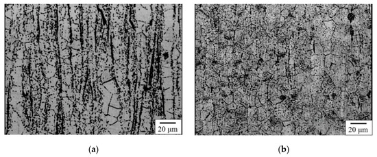 Light microscopy (LM) microstructural images. (a) XK105-F and (b) XK105-H.
