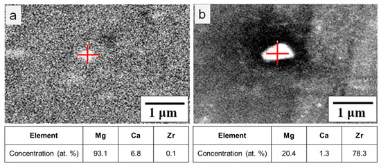 Secondary phase analysis of XK105-F using scanning electron microscopy (SEM) and energy-dispersive X-ray spectrometry (EDS). (a) Mg2Ca and (b) Zr particles.
