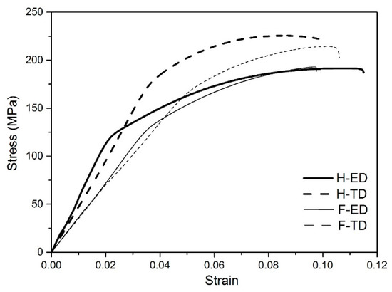 Tensile stress-strain curves of XK105. (H-ED: extrusion direction of XK105-H; H-TD: transverse direction of XK105-H; F-ED: extrusion of XK105-F; F-TD: transverse of XK105-F).