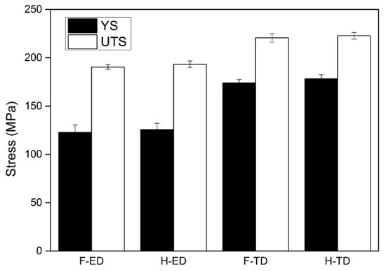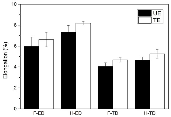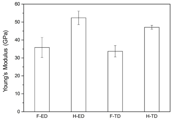 Young’s modulus of XK105. (H-ED: extrusion direction of XK105-H; H-TD: transverse direction of XK105-H; F-ED: extrusion of XK105-F; F-TD: transverse of XK105-F).