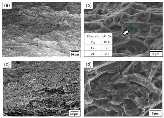 Figure 8a,b shows the tensile fracture morphology of XK105-H on the ED plane. Dimples can be observed on the fracture surface. Mg2Ca, which did not dissolve into the matrix, appears inside the dimples. Figure 8c,d shows the tensile fracture morphology of XK105-H on the TD plane. Thin wall structures can be observed. These structures are cleavages of brittle failure.