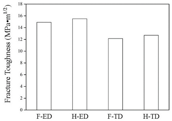Fracture toughness results for XK105. (H-ED: extrusion direction of XK105-H; H-TD: transverse direction of XK105-H; F-ED: extrusion of XK105-F; F-TD: transverse of XK105-F).