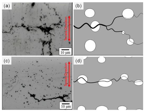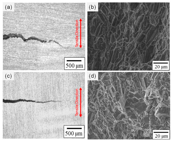 Fracture mechanism of XK105-H. (a) LM secondary surface morphology on ED plane, (b) fracture mechanism illustration for ED plane, (c) LM secondary surface morphology on TD plane, and (d) fracture mechanism illustration for TD plane.