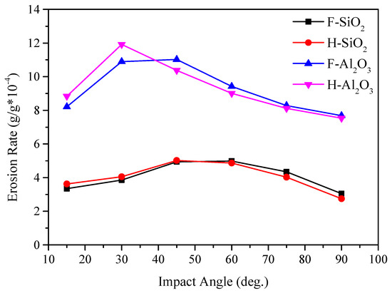 Figure 12 shows the relationship between erosion rate and erosion angle. For both Al2O3 or SiO2, the angle for the highest erosion rate changed from 45° to 30° after heat treatment. This shows that XK105 had lower hardness and higher ductility after heat treatment. The erosion rate obtained with Al2O3 particles was higher than that obtained with SiO2 due to the higher hardness of Al2O3.