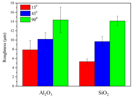 Figure 13 shows the surface roughness after the erosion test. The roughness obtained with Al2O3 and SiO2 was similar. The highest and lowest roughness was obtained with erosion angles of 90° and 15°, respectively. The measurement of these erosion properties could be applied to later experiments to clarify the relationship between anti-corrosion ability and surface roughness. This will have a benefit of increasing the bioreactivity for medical applications.