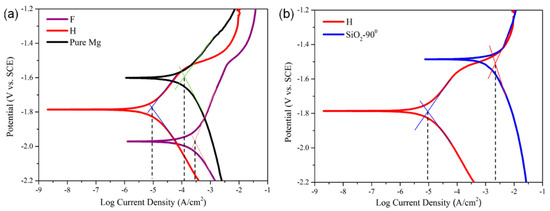 Potentiodynamic polarization curve of XK105. (a) Comparison of XK105-F, XK105-H, and pure Mg and (b) comparison of XK105-H before and after erosion test by SiO2 particles with erosion angle of 90°.