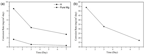Corrosion rate in immersion test (a) XK105-H and pure Mg and (b) surface-roughened XK105-H.