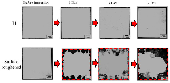 where m1 is the mass after immersion, m0 is the mass before immersion, A is the total surface area of the sample, and T is the immersion time. The immersion solution was R-SBF. XK105-H and surface- roughened XK105-H sampled were immersed in R-SBF for 1, 3, and 7 days at a constant temperature of 37 °C.