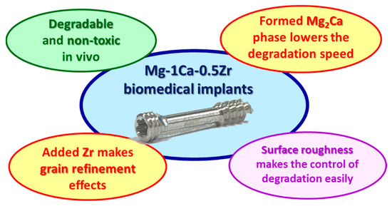 To summarize the above results, Mg-1Ca-0.5Zr biomedical alloy has a suitable degradation rate and good mechanical strength. The surface roughness can help control the degradation rate. Mg-1Ca-0.5Zr can thus be applied for biomedical implants. A summary is shown in Figure 18.