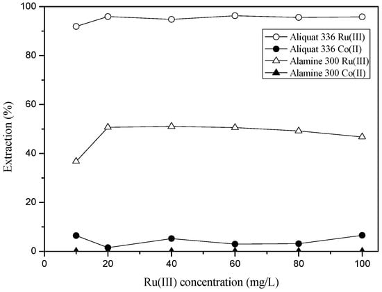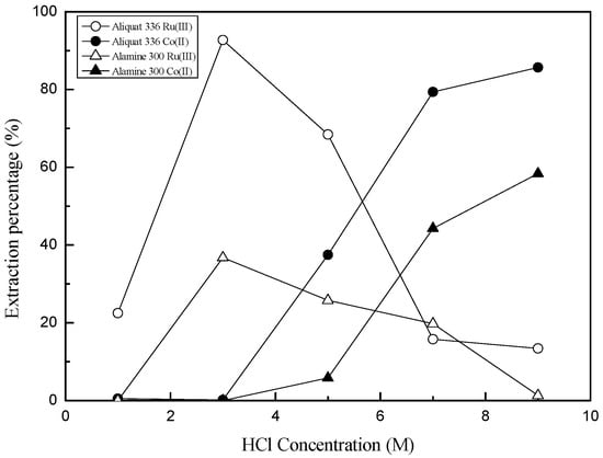 The different dependence of the extraction of Ru(III) and Co(II) on HCl concentration indicates that control of HCl concentration is very important for the separation of the two metal ions by solvent extraction. When HCl concentration was 3 M, only Ru(III) was extracted by Aliquat 336 and Alamine 300. By contrast, a small amount of Ru(III) was extracted together with Co(II) when HCl concentration was higher than 7 M.