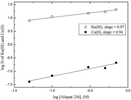 The extraction percentage of Ru(III) by Aliquat 336 was higher than that by Alamine 300. Therefore, the effect of Aliquat 336 concentration was investigated by varying its concentration from 0.05 M to 0.7 M (see Figure 3). In these experiments, the concentration of Ru(III) and Co(II) in 3 M HCl solution was 10 and 100 mg/L, respectively. Within Aliquat 336 concentration from 0.05 M to 0.7 M, the plot of log [Aliquat 336] vs. log D of Ru(III) and Co(II) results in linear lines whose slope values were close to unity. The slope values of Figure 3 indicate that one mole of Aliquat 336 takes part in the solvent extraction of one mole of Ru(III) and Co(II) from 3 M HCl solution. Since the distribution coefficient of Co(II) increased linearly with Aliquat 336 concentration, it is better to reduce Aliquat 336 concentration and increase the number of counter-current stages in terms of the separation feasibility.