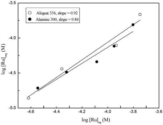 The extraction behavior of Ru(III) by the two amines was investigated to identify the existence of polymerized Ru(III) species in the organic phase. For this purpose, the concentration of HCl was fixed at 3 M and then that of Ru(III) was varied from 10 to 100 mg/L. The log vs. log plot of the concentration of Ru(III) in the aqueous and organic phase is shown in Figure 4. The slopes of the straight lines were around one, indicating that the Ru(III) in the loaded organic exists as a monomer. Based on these results together with the data in Figure 3, the solvent extraction reaction of Ru(III) by Alamine 300 and Aliquat 336 can be represented as Equations (1) and (2), respectively [,,].