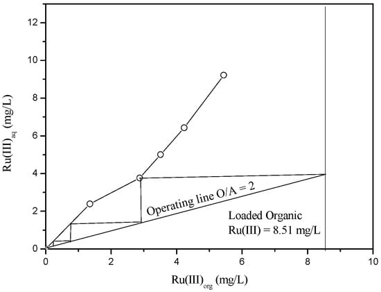 When HCl concentration is too low, there might be some change in the predominant species of Ru(III). Therefore, 0.1 M HCl was selected as an optimum stripping solution and a McCabe-Thiele stripping diagram was constructed. The volume ratio of aqueous to organic was varied from 10:1 to 1:3 and the corresponding McCabe-Thiele diagram is shown in Figure 6. Three stages of counter-current stripping are necessary to strip the Ru(III) completely from the loaded Aliquat 336 at an O/A ratio of two.