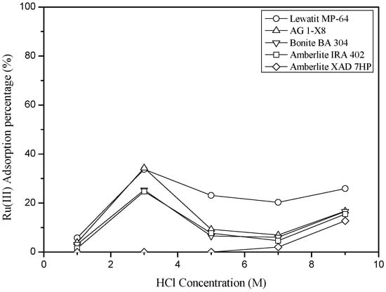 In order to investigate the possibility of separating Ru(III) and Co(II) by ion exchange, the HCl concentration was varied from 1 M to 9 M. In these experiments, the concentration of Ru(III) and Co(II) was fixed at 10 and 100 mg/L, respectively, while the concentration of the anion exchange resins (AG 1-X8, Amberlite IRA 402, Amberlie XAD 7HP, Bonite BA 304, and Lewatit MP-64) was fixed at 0.5 g/L. The loading percentage of Ru(III) by the anion resins was the highest when HCl concentration was 3 M HCl, which is the same as the solvent extraction results of Ru(III) (see Figure 7). Unlike solvent extraction results, Co(II) was not loaded at all into the above resins in our experimental ranges. Even though HCl concentration was higher than 6 M, Co(II) was not loaded into the resins. The loading percentage of Ru(III) by AG 1X-8 and Lewatit MP-64 from 3 M HCl solution was the same and the ion exchange reaction can be represented as Equation (3) [,].