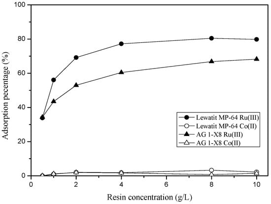 Effect of resin concentration on the adsorption of Co(II) and Ru(III) onto AG 1-X8 and Lewatit MP-64. ([Time] = 6 h, [Co(II)] = 100 mg/L and [Ru(III)] = 10 mg/L).