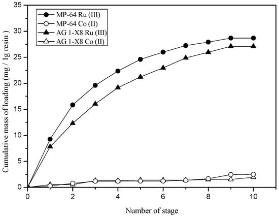 Loading capacity of AG 1-X8 and Lewatit MP-64 for Ru(III) was measured by consecutively contacting fresh aqueous solutions. In these experiments, the concentration of the resins was fixed at 0.5 g/L. Figure 9 shows the cumulative mass of Ru(III) loaded into the two resins. The loading capacity of AG 1-X8 and Lewatit MP-64 was determined to be 27.1 and 28.7 mg of Ru(III) by 1 g of resin, respectively.