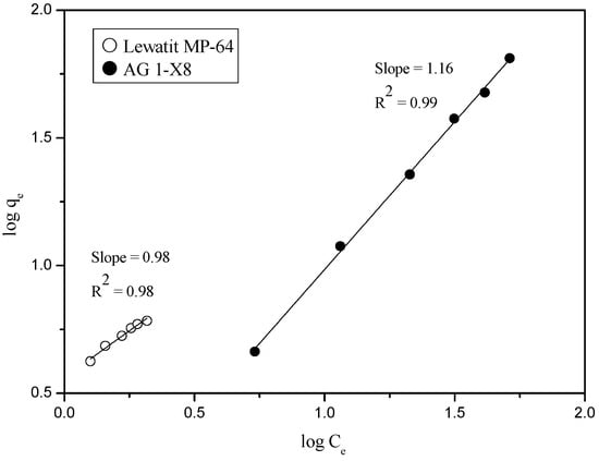 In order to identify the loading isotherm of Ru(III) into the AG 1-X8 and Lewatit MP-64 resins, Freundlich isotherm was plotted from the loading data obtained from 3 M HCl. Figure 10 indicates that the loading of Ru(III) into the two resins follow the Freundlich isotherm, which can be represented as Equation (4) [].