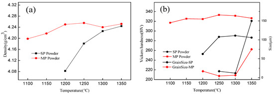 | Temperature (°C) | Time (h) | Density (g/cm3) | Size (μm) | Vickers Hardness (HV) | Troom Bending Strength (MPa) | Microstructure |