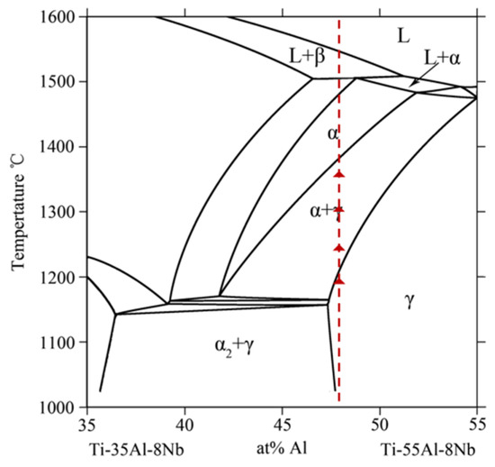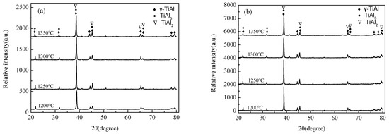 3.2. Effect of Sintering Temperature on Density and Vickers Hardness of Ti-48Al-2Cr-8Nb Alloy