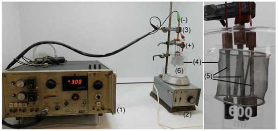 Experimental apparatus for electrochemical hydrogen charging: (1) potentiostat, (2) solute mixer, (3) samples holder, (4) platinum mesh electrode, (5) tensile samples, (6) electrolytic solution.