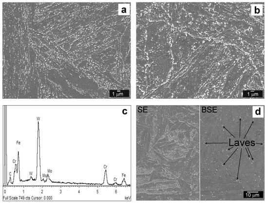 The microstructure of the T92 BM region in QT PWHT state (Figure 3a) consists of tempered martensitic laths inside the blocks and packets structures within prior austenitic grains. In thermally-aged T92 BM microstructure (Figure 3b) typical features of microstructure recovery have been indicated such as lath widening and/or formation of new subgrains. As it was discussed in our previous paper [14], the phase composition of the T92 BM region in its initial condition consists of ferrite matrix and secondary phase precipitates M23C6 (M = Cr, Fe,…) and MX (M = V, Nb, X = C, N) carbo-nitrides. As indicated by EDX analysis (Figure 3c), thermal aging led to additional precipitation of Fe2(W,Mo) Laves phase and its rapid coarsening (Figure 3d). The results of microstructure and phase analyses are in agreement with the results of other studies about Grade 92 tempered martensitic steels published previously [31,32,33,34,35,36].