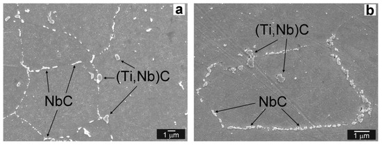 The Ni WM region in QT PWHT state (Figure 4a) consists of “nickel–austenite” matrix with primary (Ti,Nb)(C,N) and (Ti,Nb,B)(C,N) precipitate particles [14] and secondary precipitates of mostly NbC type [14]. In Ni WM region located close to the T92 BM/Ni WM interface, grain-boundary carbides of Cr23C6 type have also been detected [14]. The primary precipitates were distributed randomly within Ni WM microstructure, i.e., they were located on grain boundaries as well as in grain interiors. Regardless of slight precipitate coarsening and thermally-activated grain boundaries migration, the microstructure of thermally-aged Ni WM (Figure 4b) preserved its original heterogeneous features as observed in its initial QT PWHT state. Near the T92/Ni WM interface parallel to the fusion boundary, a so-called “Type-II boundary” was observed in initial Ni WM microstructure (Figure 5a). The Type-II boundary is a specific microstructural object typically observed in Ni WM interfacial microstructure of Ni-based transition weldments [37,38,39]. The Type-II boundary formation in such dissimilar welded joints is known to be related to the phase transition of δ-bcc crystal structure of the base metal to γ-fcc phase during welding. As it was shown by Nelson et al. [40] and Lippold et al. [41], during allotropic δ-to-γ-transformation in austenite temperature range, a δ/γ boundary becomes a γ/γ boundary and it migrates into the weld metal as a result of temperature and compositional gradient. During thermal aging, the Type-II boundary can migrate further away from the fusion boundary [42]. This behavior was observed also in the present work (Figure 5b).
