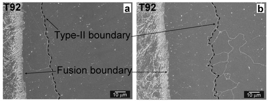 1. Type-II boundary was observed in the microstructure of Ni-based weld metal parallel to the T92 BM/Ni WM fusion boundary at a distance of about 10–20 μm from the fusion boundary. The occurrence of Type-II boundary migration has been indicated after performed thermal exposure;