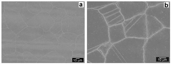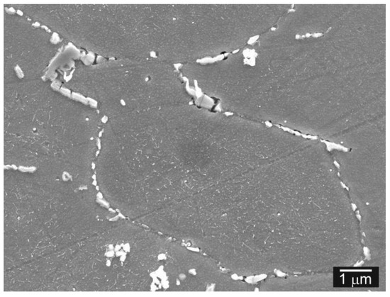 The TP316H BM region in QT PWHT state (Figure 6a) is formed of polygonal recrystallized austenitic grains with secondary phase precipitates of M23C6 carbide on grain boundaries [14]. The same phase composition was also observed in other studies on similar types of AISI 316 grade austenitic steels [43,44]. An obvious consequence of thermal exposure of austenitic TP316H BM is related to a formation of annealing twin boundaries after performed ageing (Figure 6b).