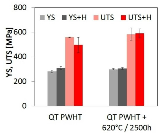 Effects of isothermal aging at 620 °C and electrochemical hydrogen charging on the room-temperature strength properties of T92/TP316H dissimilar weldments (YS—yield stress, UTS—ultimate tensile strength).