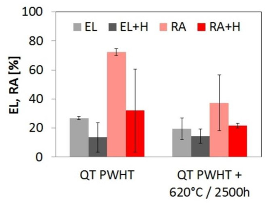 Figure 7 and Figure 8 show the effects of isothermal aging at 620 °C and subsequent electrochemical hydrogen charging at room-temperature on tensile properties of the investigated weld joints. Figure 7 shows a variation of strength properties (YS and UTS), whereas Figure 8 shows a variation of plastic properties (EL, RA). The results presented in Figure 7 show that applied thermal exposure of studied weldments resulted in negligible changes of their strength properties (YS and UTS). Such a behavior is commonly observed for 9-12Cr heat resistant steels, austenitic steels, and their weld joints [13,26,28,31,39,45]. After the application of hydrogen charging, the values of YS and UTS were only slightly affected. The individual values varied within the range of their standard deviations. Rosenberg and Sinaiová [46] reported that influence of hydrogen on mechanical properties depends on the used mechanical testing conditions. However, they showed that for aged smooth specimens of high strength steels, hydrogenation practically did not affect the values of YS and UTS which qualitatively agrees with the results of present investigation.