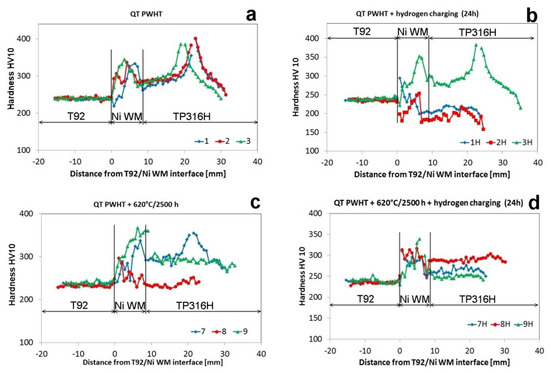 Effects of isothermal aging at 620 °C and electrochemical hydrogen charging at room temperature on the cross-weld hardness profiles determined after room-temperature tensile tests of T92/TP316H dissimilar weldments, states: QT PWHT (a); QT PWHT + H (b); QT PWHT + 620 °C/2500 h (c); QT PWHT + 620 °C/2500 h + H (d).